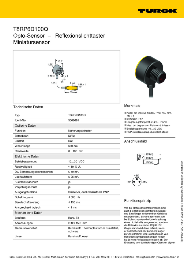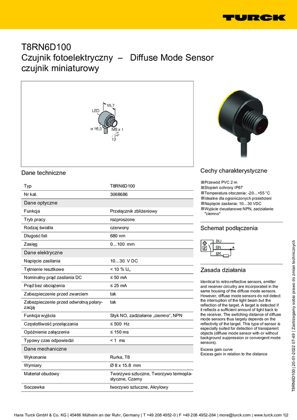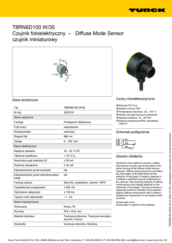 Czujnik dyfuzyjny Turck T8RN6D100 3068686 przełączanie w ciemności 1 szt.