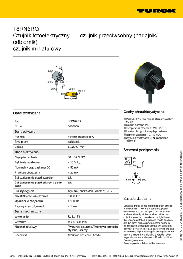 Czujnik dyfuzyjny Turck T8RN6D50 3066657 przełączanie w ciemności 1 szt.