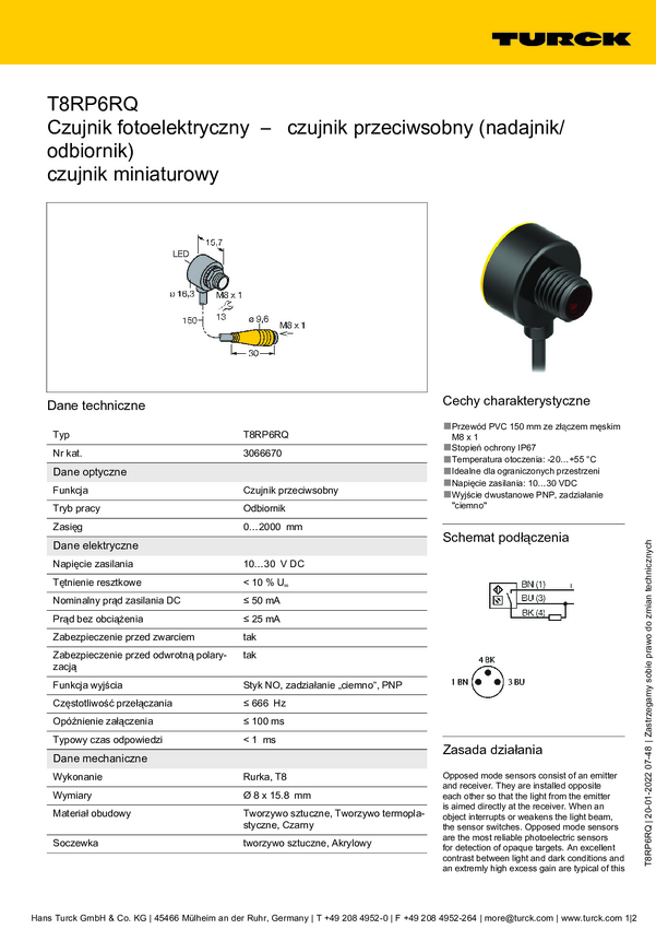 Bezzwrotny czujnik fotoelektryczny Turck T8RP6R 3066669 1 szt.