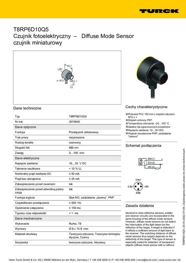 Czujnik dyfuzyjny Turck T8RP6D50 3066661 przełączanie w ciemności 1 szt.