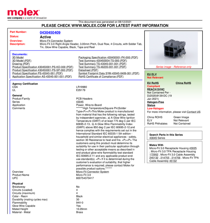 Molex Listwa kołkowa, męska, do wbudowania, standardowa Ilość pinów 4 Wymiary siatki: 3 mm 430450409-1800 1800 szt. taśm