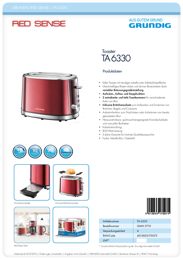 Grundig TA6330 Toster z podgrzewaczem do bułek czerwony (metaliczny), stali szlachetnej