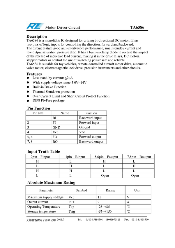 Układ scalony; TA6586; driver; sterownik silnika DC; 5A; 3-14V; 2 kanały; DIP8; THT; Wuxi Smart Microelectronics; RoHS