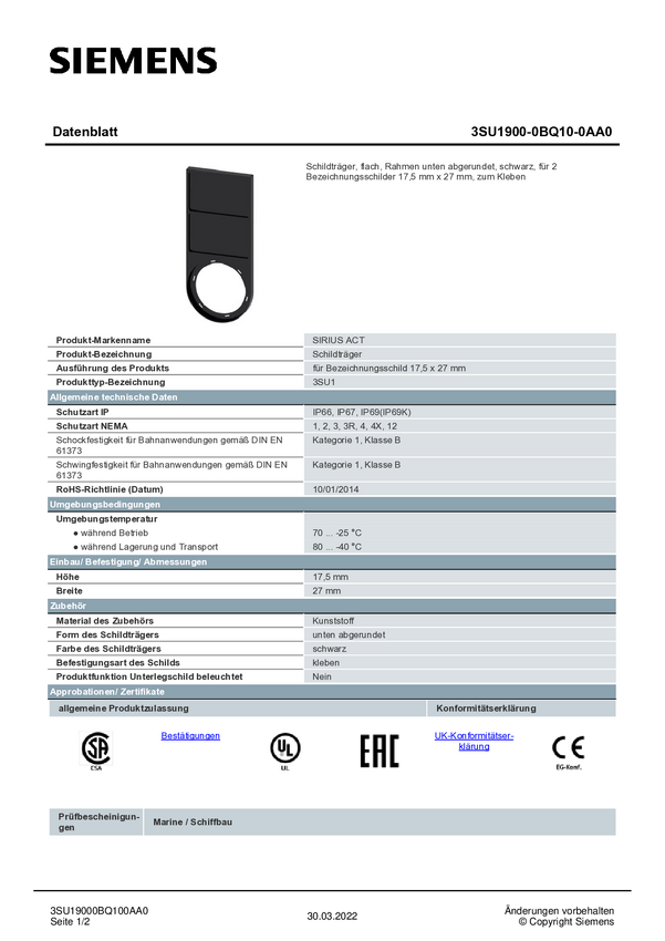 Uchwyt tabliczki Siemens 3SU1900-0BQ10-0AA0 (S x W) 27 mm x 17.5 mm 10 szt.