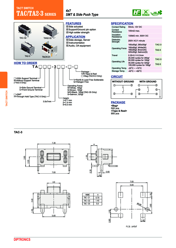 Switch Tactile N.O./N.C. SPST Rectangular Button Gull Wing 0.05A 12VDC 50000Cycle 1.56N SMD T/R