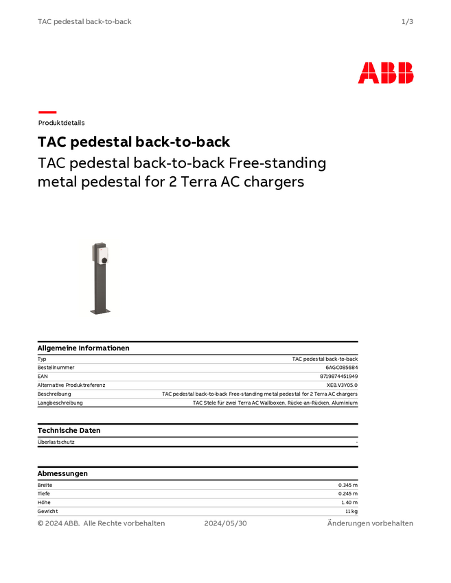 ABB TAC-W11-G5-R-0 Stacja ładowania samochodów elektrycznych Typ 2 11 kW