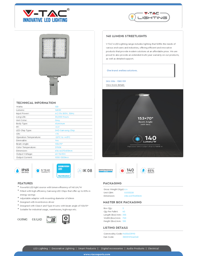 V-TAC 886 Lampa uliczna LED EEK: D (A - G) LED LED wbudowany na stałe 120 W aluminiowy