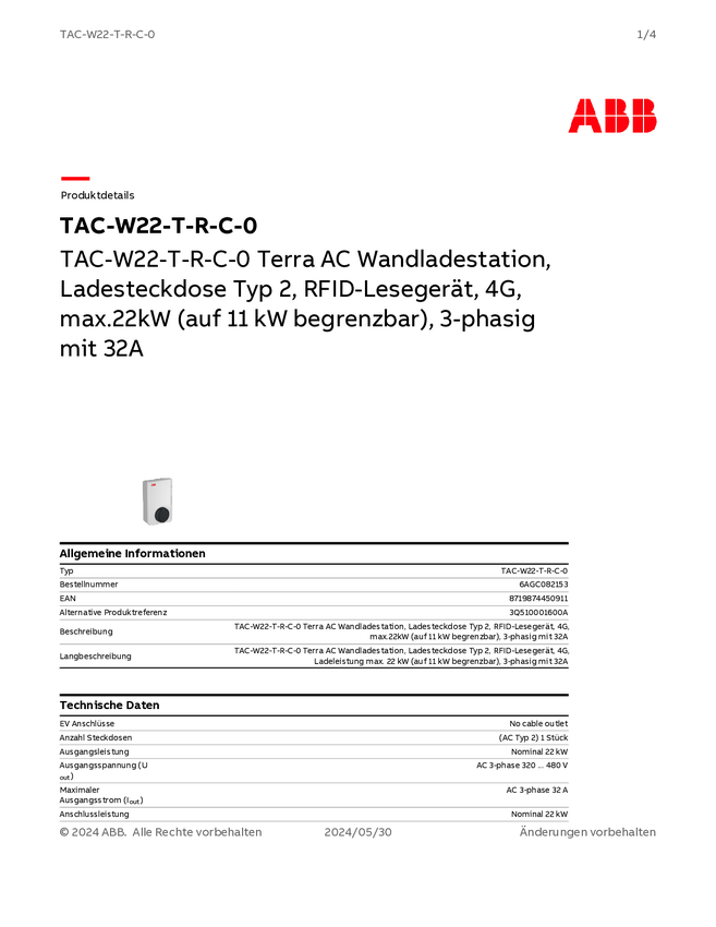 ABB TAC W22-T-RD-PC-0 Stacja ładowania samochodów elektrycznych Typ 2 22 kW