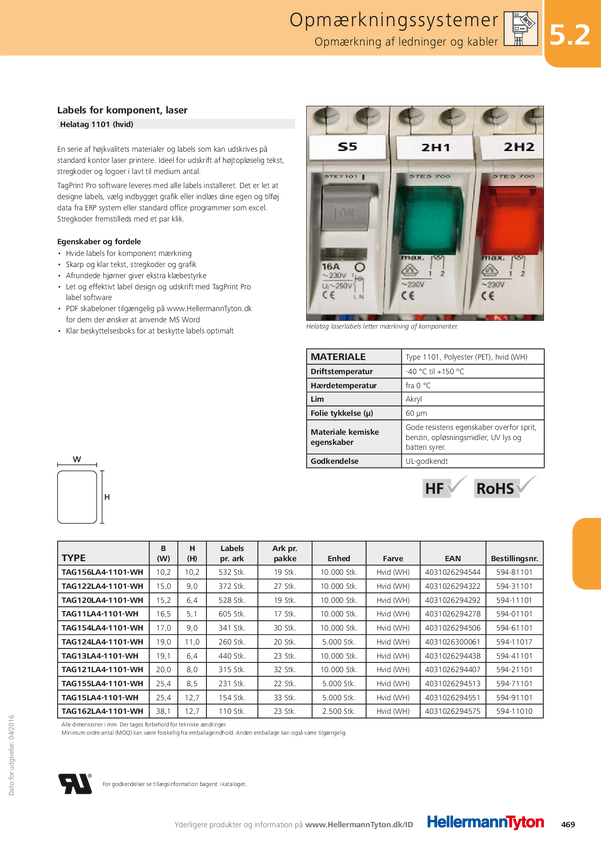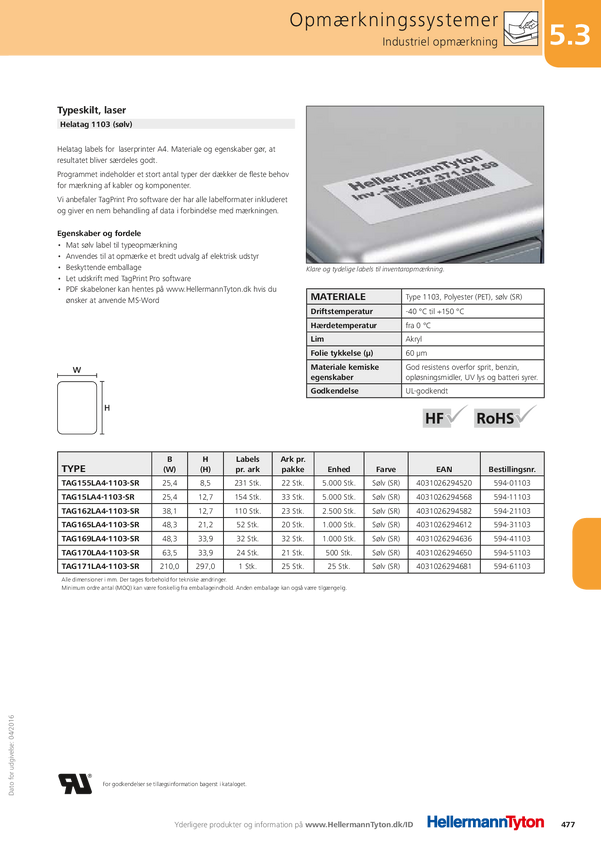 Etykieta do druku laserowego HellermannTyton TAG162LA4-1103-SR-1103-ML 594-21103, 2500 szt.