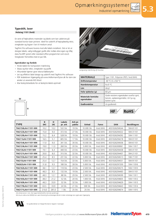 Etykieta do druku laserowego HellermannTyton TAG163LA4-1101-WH-1101-WH 594-11011, 2500 szt.