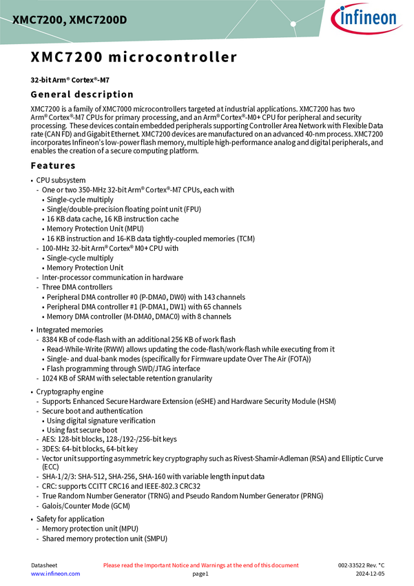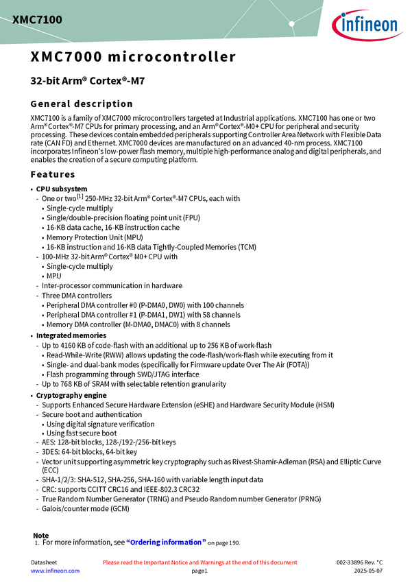 The XMC7100/7200 series belongs to the XMC7000 family of 32-bit industrial microcontrollers based on -up to two- ARM Cortex-M7 processor cores. The XMC7100/7200 series of microcontrollers take advantage of Infineon's decades of experience in microcontroller design, providing an optimized solution to meet the performance challenges of today's embedded control applications. The XMC7000 family combines the extended functionality and performance of the ARM Cortex-M7 cores with powerful on-chip peripheral subsys