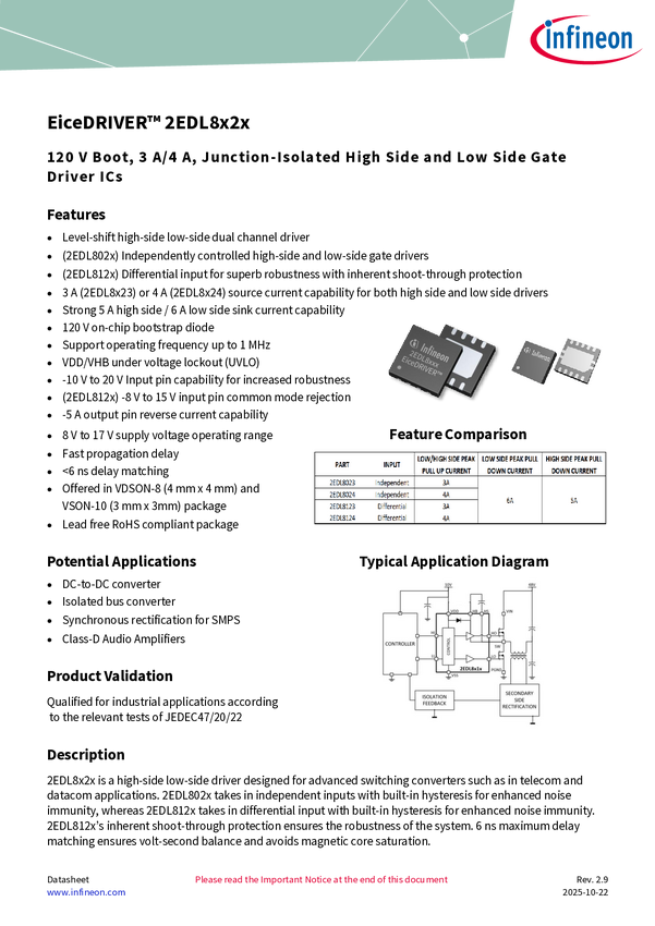 120 V high side and low side 2EDL8023G3C EiceDRIVER™ 2EDL8023G3C is a high-side and low-side driver designed for advanced switching converters such as in telecom and datacom applications. 2EDL8023G3C takes in independent inputs with built-in hysteresis for enhanced noise immunity. 2EDL8023G3C have an integrated 120 V boot-strap diode as well as a precise channel-to-channel propagation delay matching <6 ns that ensures volt-second balance and avoids magnetic core saturation. The driver comes in small 3x3