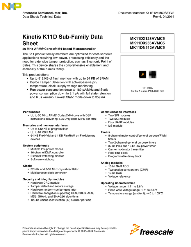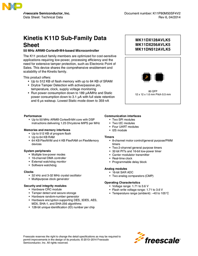 Kinetis<sup>&#174;</sup> K11-50 MHz, Anti-Tamper Microcontrollers (MCUs) based on Arm<sup>&#174;</sup> Cortex<sup>&#174;</sup>-M4 Core