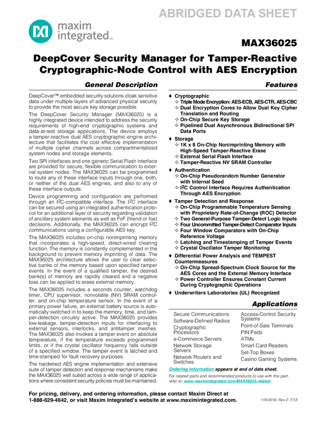 MAX36025 DeepCover Security Manager for Tamper-Reactive Cryptographic-Node Control with AES Encryption