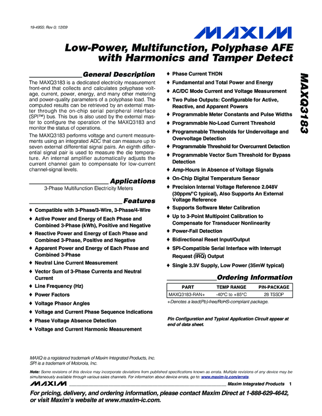 MAXQ3183 Low-Power, Multifunction, Polyphase AFE with Harmonics and Tamper Detect