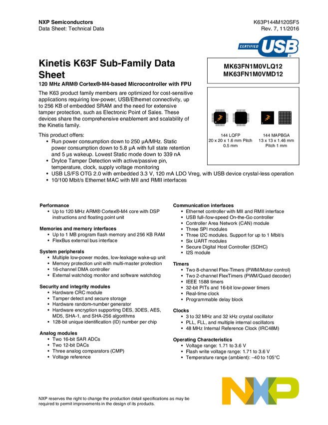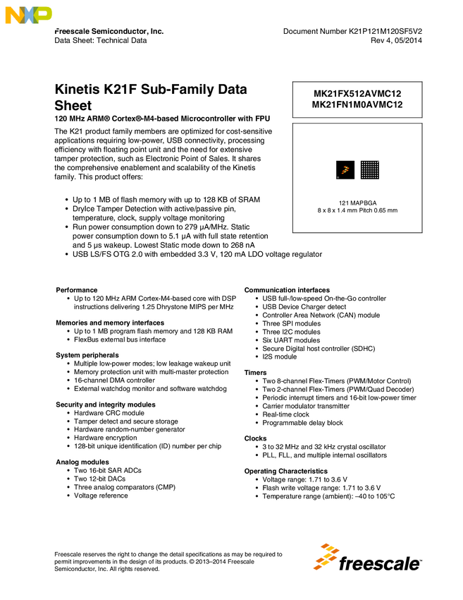 Kinetis K21-120 MHZ, Full-Speed USB, Anti-Tamper Microcontrollers based on Arm<sup>&#174;</sup> Cortex<sup>&#174;</sup>-M4