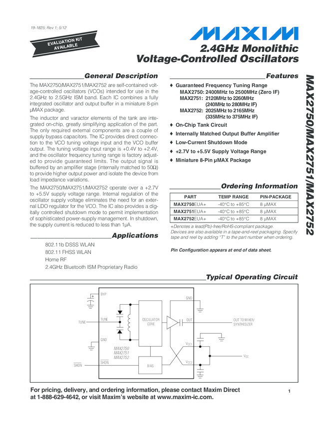 MAX2752 2025MHz to 2165MHz Monolithic VCO with Integrated Tank and Low-Power Shutdown Mode.