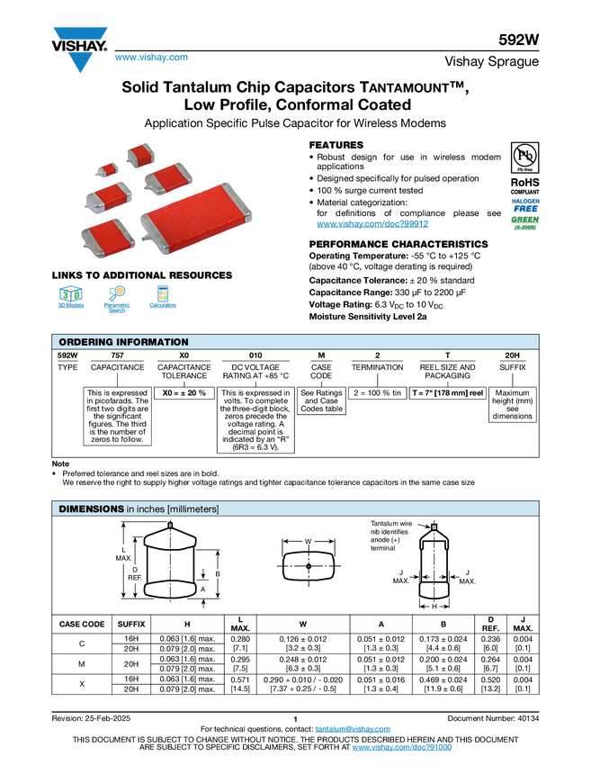 Solid Tantalum Chip Capacitors TANTAMOUNT™, Low Profile, Conformal Coated Application Specific Pulse Capacitor for Wireless Modems