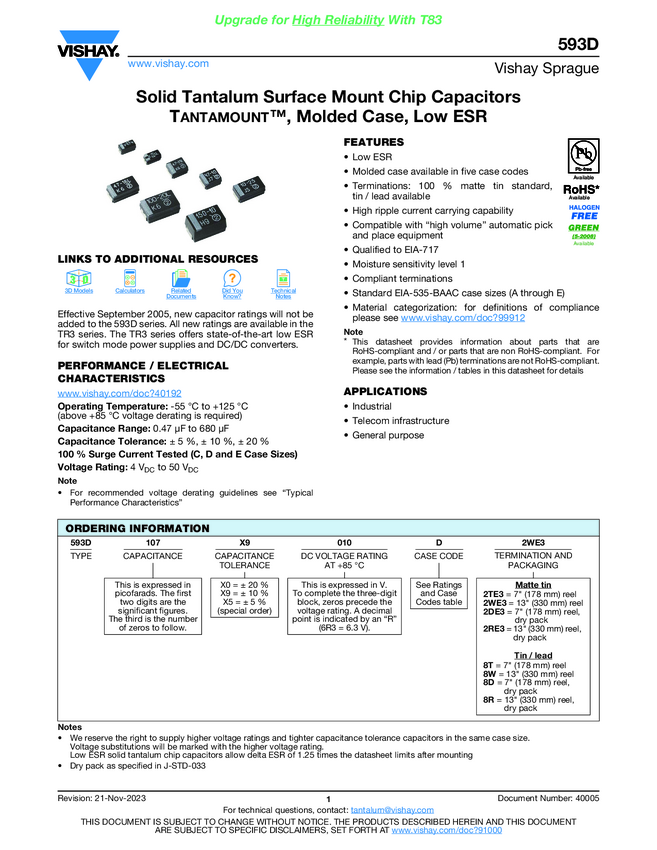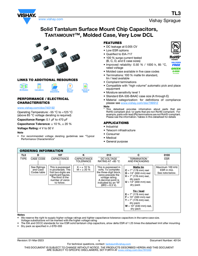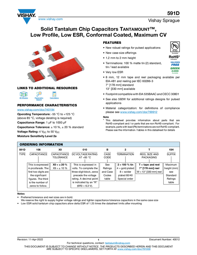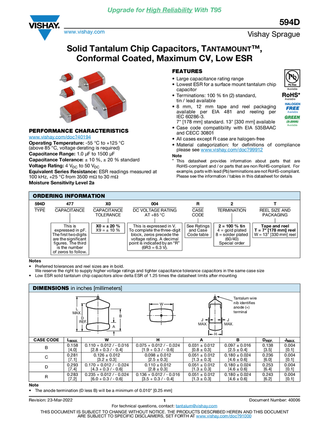 Solid Tantalum Chip Capacitors TANTAMOUNT™ Low Profile, Low ESR, Conformal Coated, Maximum CV