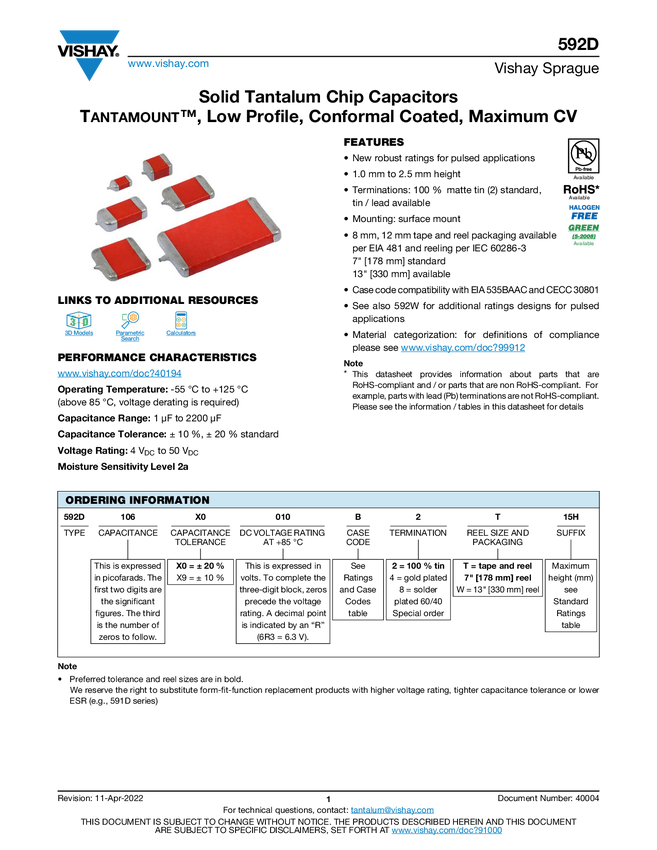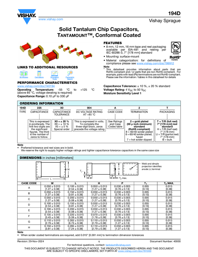 Solid Tantalum Chip Capacitors Tantamount™, Low Profile, Conformal Coated, Maximum CV