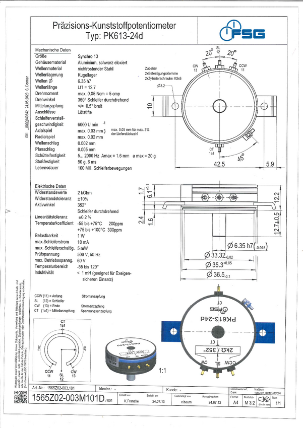 Precision Plastic Potentiometer PK613-24d Resistance element ref 36474 Drawng 2485-1113-0300 order # 0325..PK Wiper: Rotation without limit stops. Resistance: 2k? +/- 10%/ over 352° with center tapping. Shaft 6,35 mm 12,7 mm(=11,1+1,6=12,7 mm long with PH ( prawdopodobnie d=2,1 mm, L=3,7 mm ) Model podobny ale bez PH to PK613-24d-CT-2K PK613-24d-2K 1565Z02-003.101