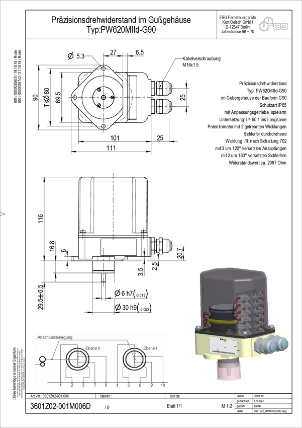 Precision Potentiometer PW620-29/90/120MIId-G90 in cast casing with cable inlet for moist atmospheres IP code IP65 Intermediate gearbox, backlash reduced 2 separate windings at separate formers wiper continuous rotation without limit stops. Winding I/II: according to circuit 702 3 tappings with 120° offset 2 wipers with 180° offset resistance approx. 2087 U Ý of driving shaft 6mm Weight: 0,800 KG Manufacturers part number is PW620MIId-G90 (3601Z02-001.006) Customs Tariff code: 85 33 31 000