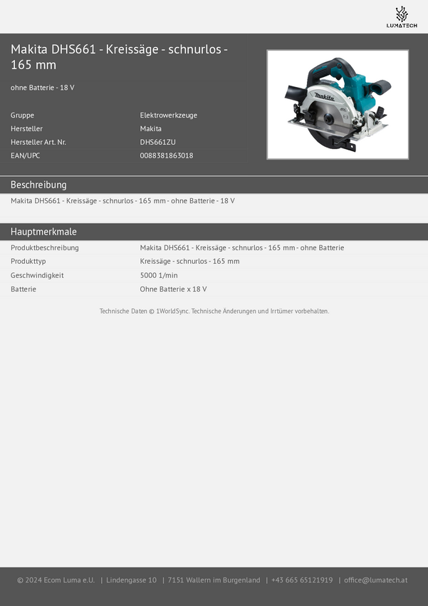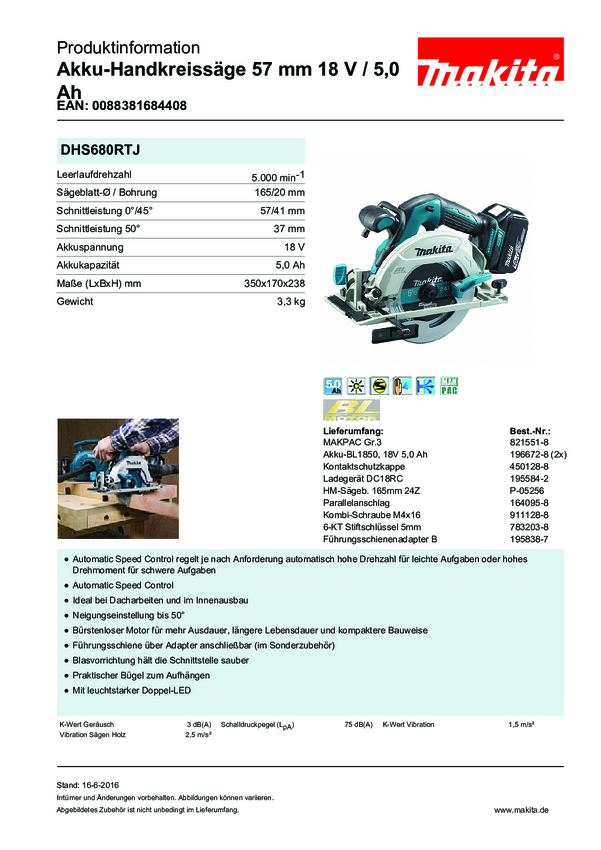 Piła tarczowa akumulatorowa Makita S_0380_5452587 18 V Głębokośc cięcia maks. (90°) 57 mm