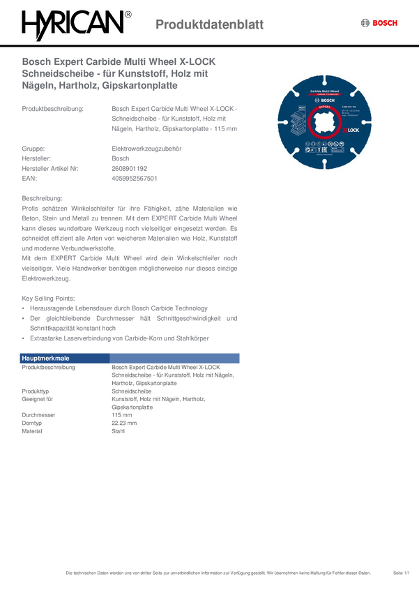 Tarcza tnąca prosta Bosch Accessories EXPERT Carbide Multi Wheel X-LOCK 2608901192 115 mm 1 szt.