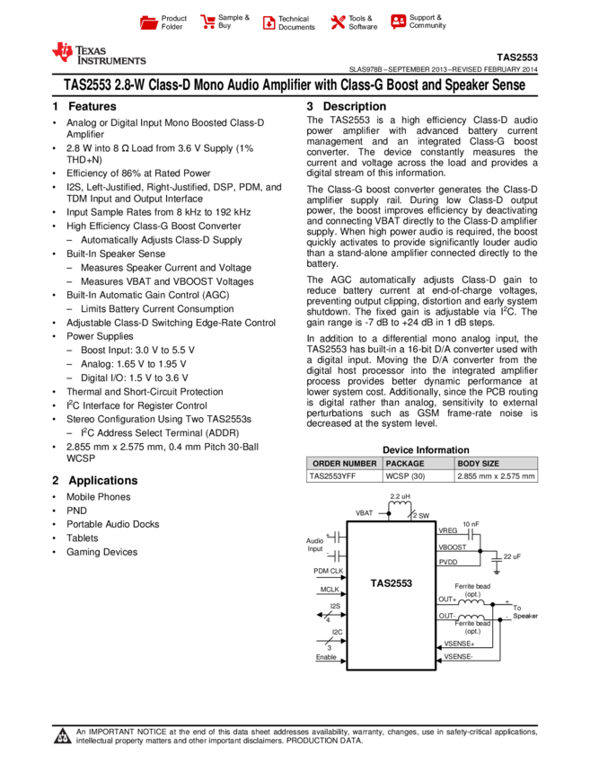 Audio Amp Speaker 1-CH Mono Class-D/Class-G 30-Pin DS-BGA T/R