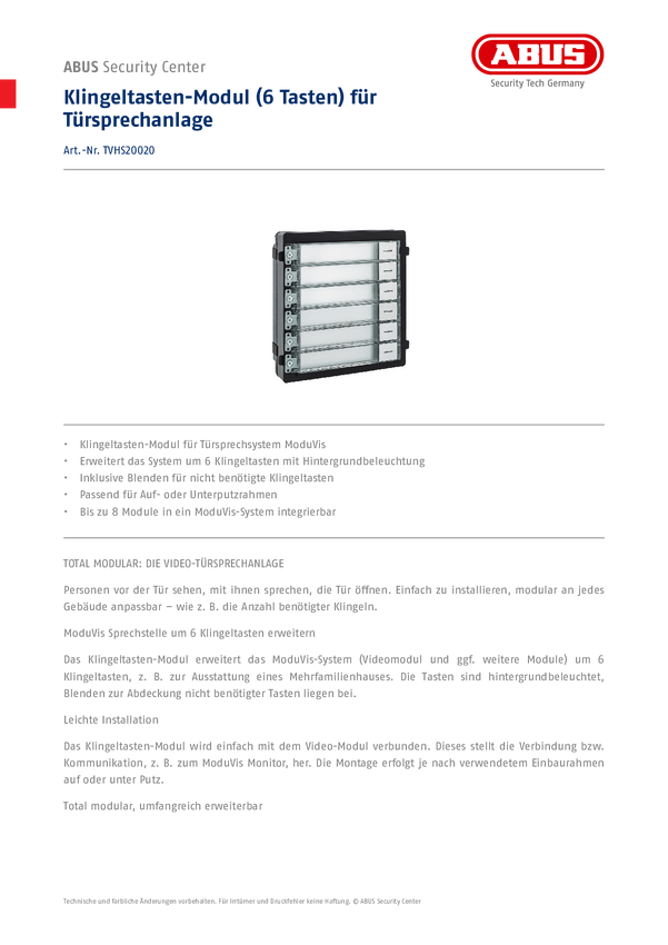 ABUS ABUS TVHS20020 Klingeltasten-Modul (6 Tasten) Moduł przycisku dzwonka TVHS20020
