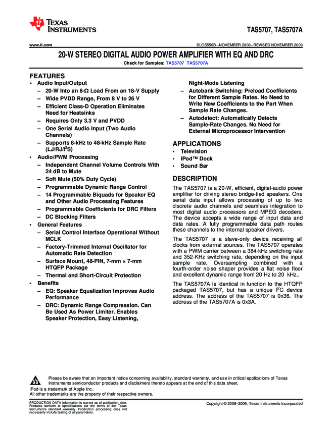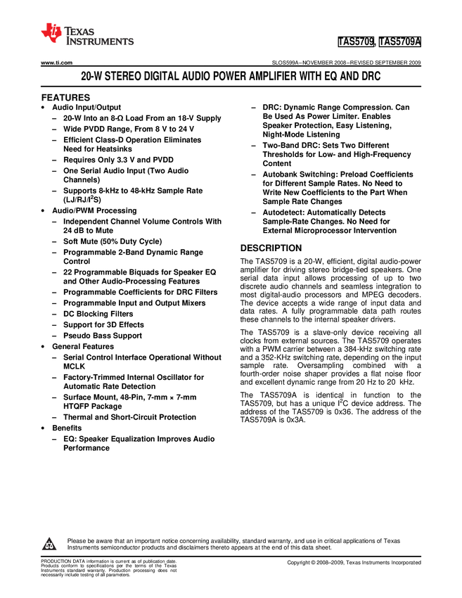 Układ scalony; TAS5709; układ audio; 2x20W; 8Ohm; 2 kanały; 8-24V; wzmacniacz audio; HTQFP48; SMD; TEXAS; RoHS