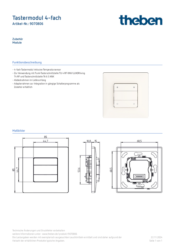 Czujnik temperatury w pomieszczeniu Theben 9070806 Tastermodul 4-fach