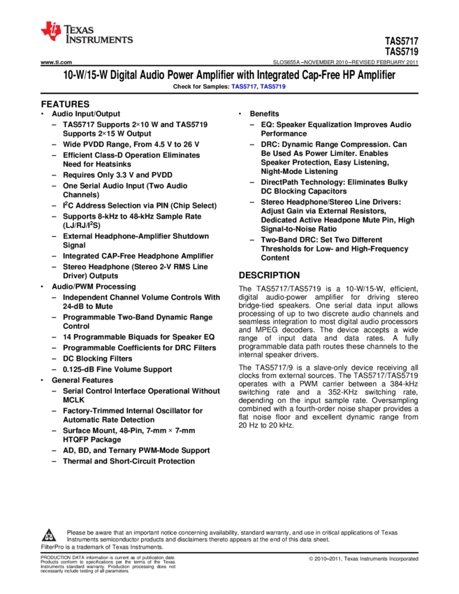 Audio Amp Headphone/Speaker 2-CH Stereo 10W Class-AB 48-Pin HTQFP EP Tray