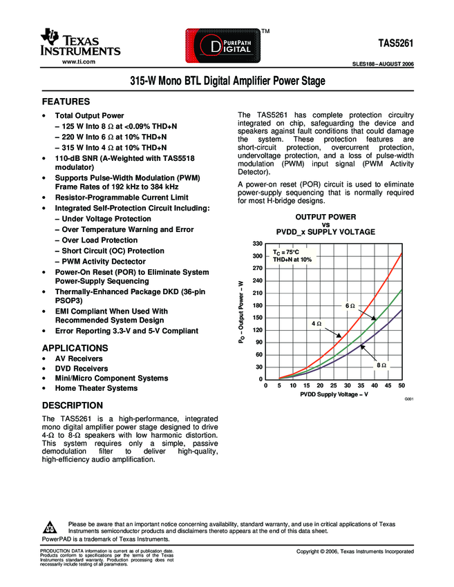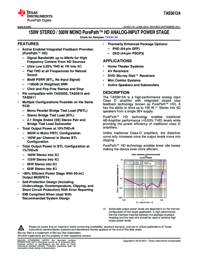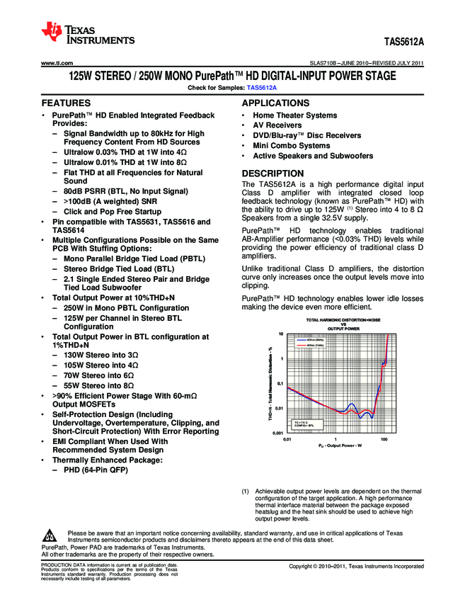 Audio Amp Speaker 1-CH Mono/2-CH Stereo 250W Class-D 64-Pin HTQFP EP T/R