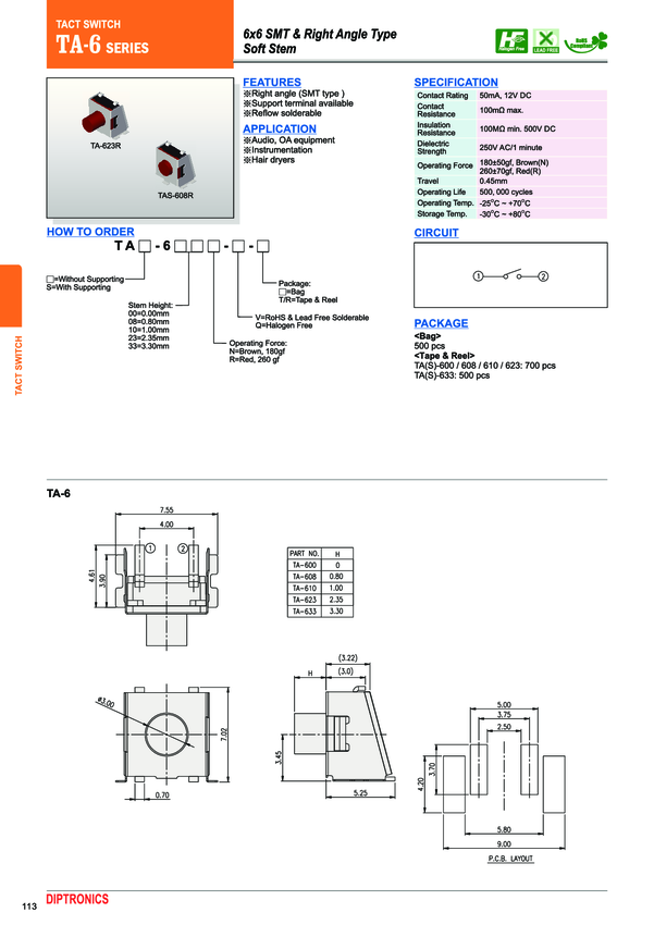 Switch Tactile N.O. SPST Round Button Solder 0.05A 12VDC 500000Cycle 1.76N SMD Bag