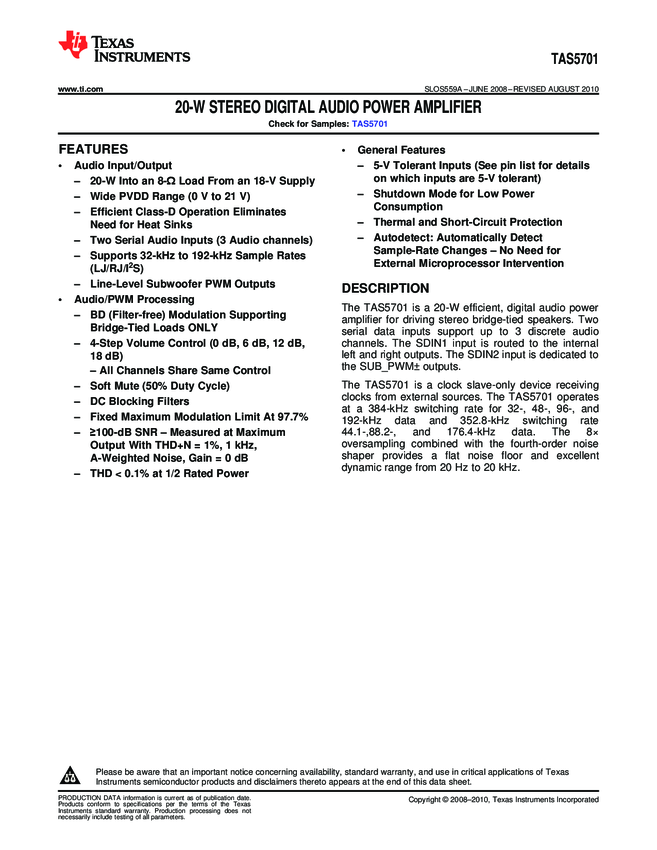 Audio Amp Headphone/Speaker 2-CH Stereo 21.5W Class-D 48-Pin HTQFP EP T/R