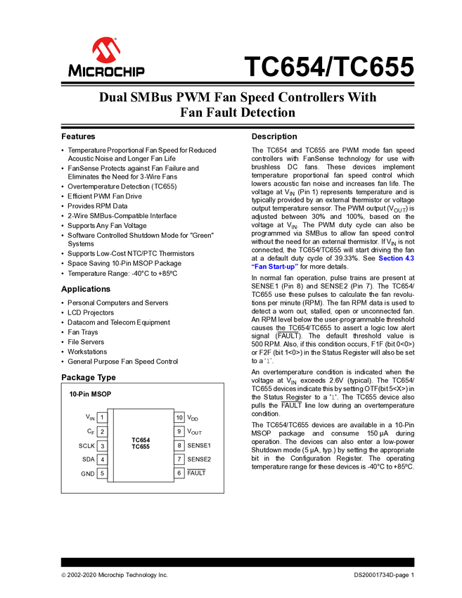 TC654/TC655 Dual SMBus PWM Fan Speed Controllers With Fan Fault Detection