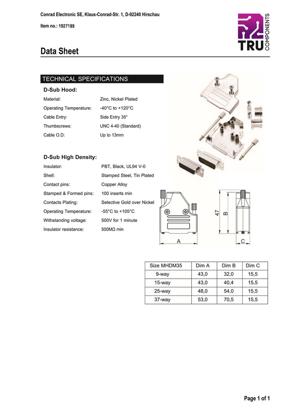 TRU COMPONENTS 7708756 Zestaw listew męskich D-Sub TCMHDM3525HDP44K, rzędy: 3, styki: 44, 35 °, 1 szt.