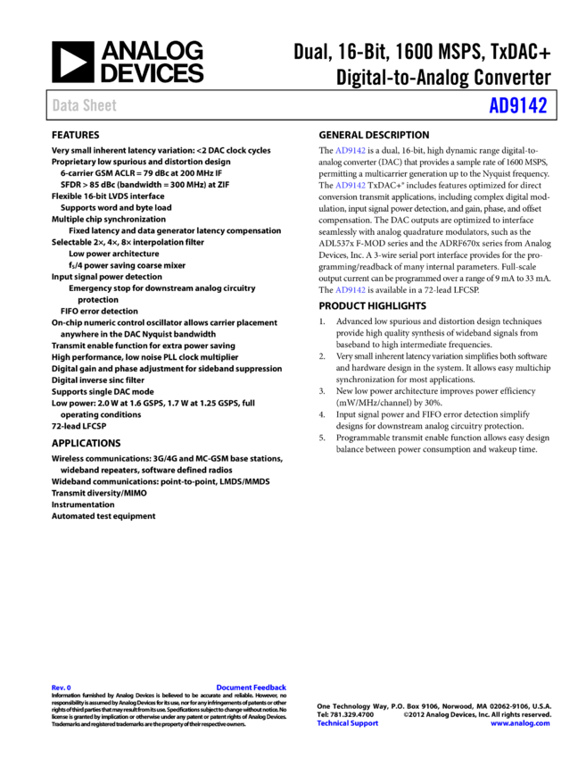 AD9142: Dual, 16-Bit, 1600 MSPS, TDAC+ Digital-to-Analog Converter