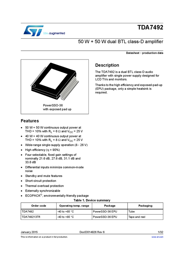50 W+50 W dual BTL class-D audio amplifier demonstration board based on TDA7492
