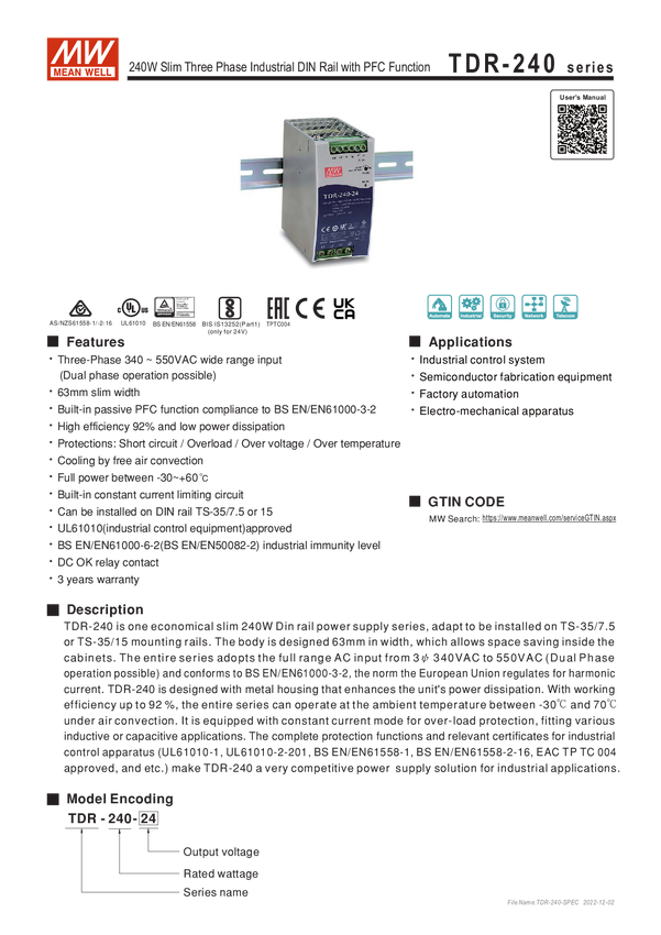 Zasilacz na szynę DIN 240W 24V 10A MEAN WELL TDR-240-24