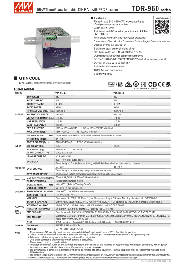 Zasilacz na szynę DIN 960W 24V 40A MEAN WELL TDR-960-24