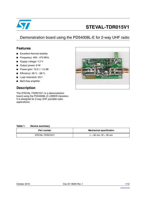 8 W / 400 - 470 MHz evaluation board based on PD54008L-E