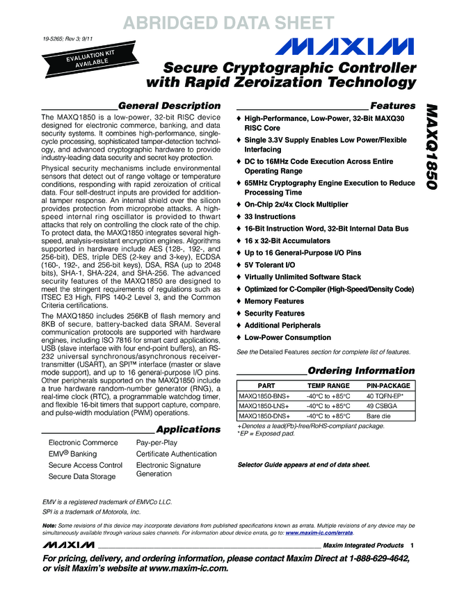 MAXQ1850 DeepCover Secure Microcontroller with Rapid Zeroization Technology and Cryptography