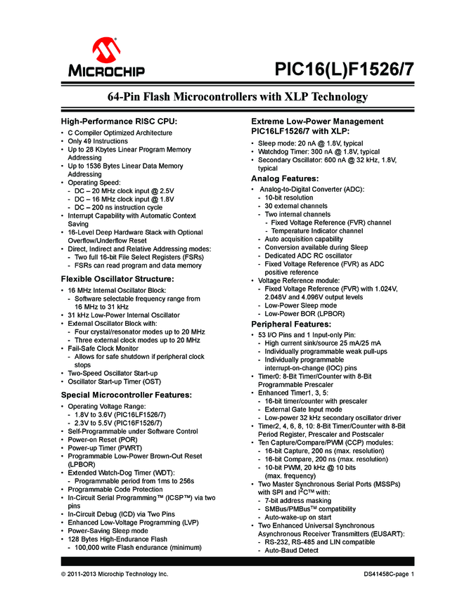 PIC16(L)F1526/1527 64-Pin Flash MCUs with XLP Technology Data Sheet (01/14/2013)