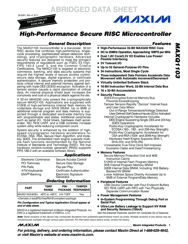 MAXQ1103 DeepCover Secure Microcontroller with Rapid Zeroization Technology and Cryptography