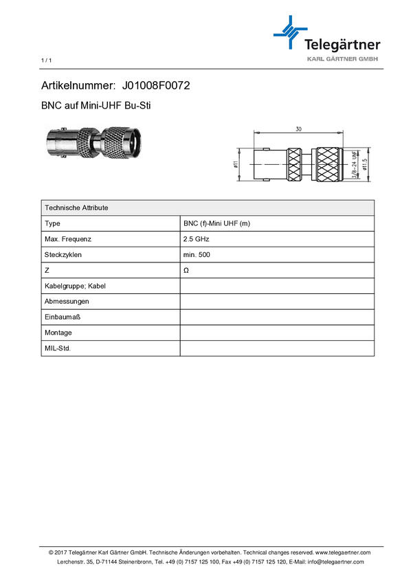 Adapter koncentryk Telegärtner 100023690 złącze żeńskie BNC - złącze męskie Mini-UHF 1 szt.