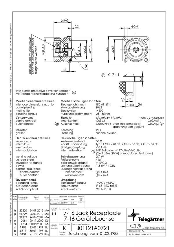Złącze 7-16 DIN Telegärtner 100024477 100024477 złącze żeńskie do wbudowania 50 Ω 1 szt.