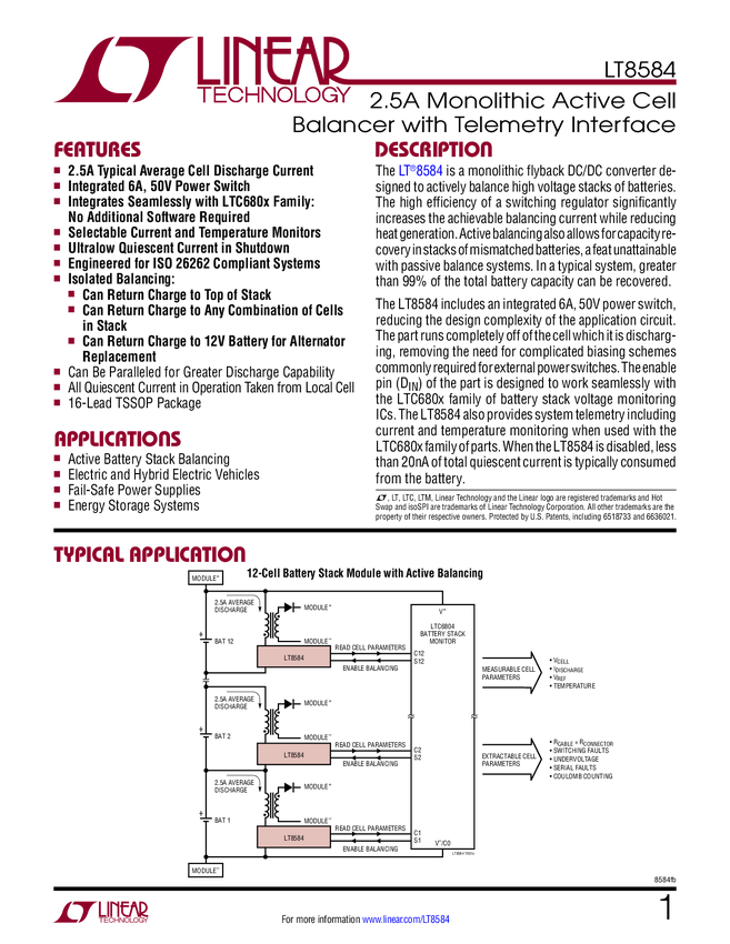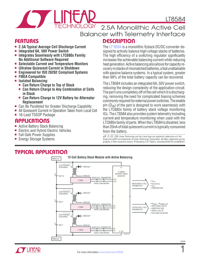 2.5A Monolithic Active Cell Balancer with Telemetry Interface