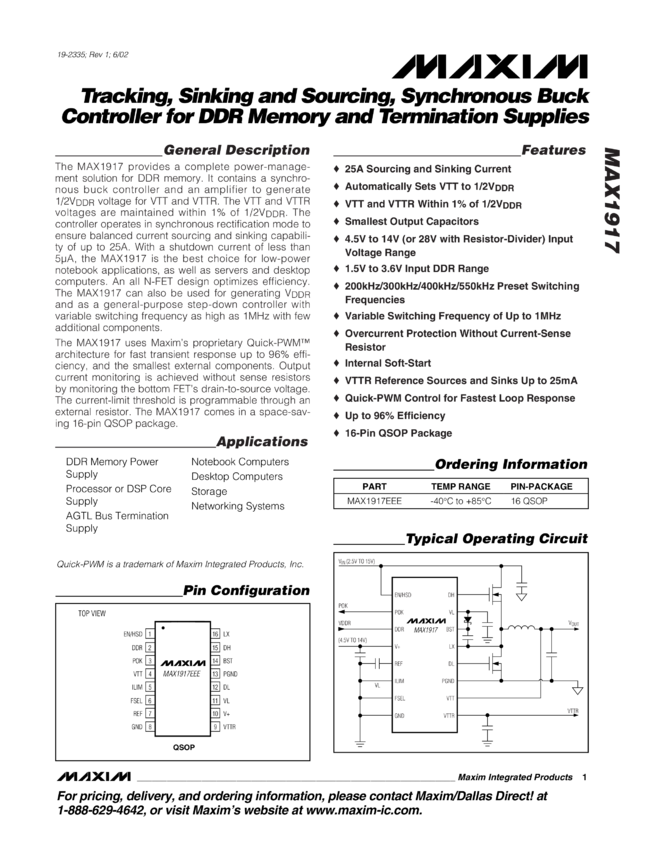 MAX1917 Tracking, Sinking and Sourcing, Synchronous Buck Controller for DDR Memory and Termination Supplies